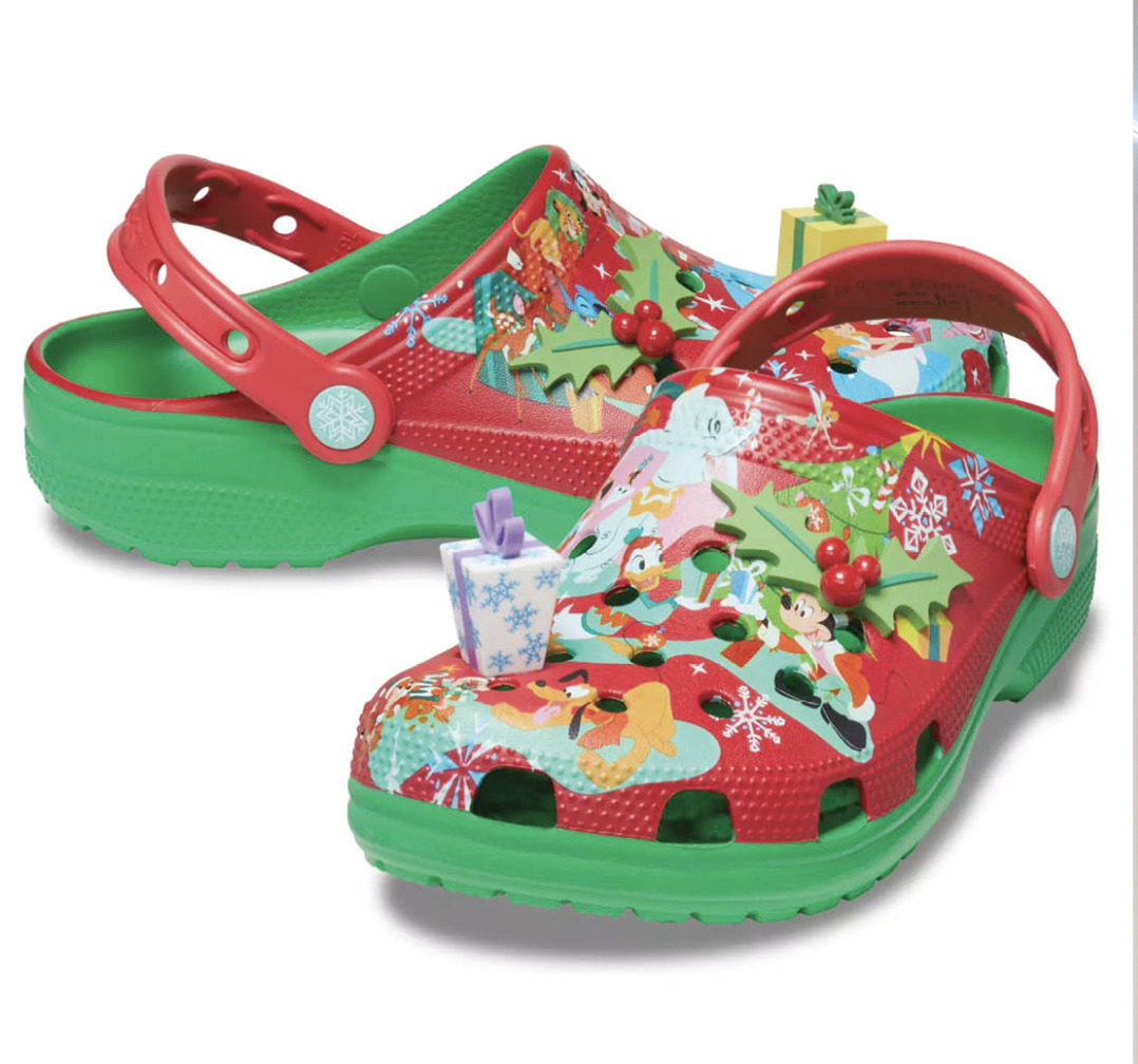 It’s a nonstop celebration with your very best pals when you slip on these Mickey Mouse and Friends holiday Crocs. The festive print features Mickey, Minnie, Pluto, Simba, Tinker Bell and others exchanging gifts by the tree. Featuring iconic Crocs comfort and style, they come with four jolly Jibbitz to make your season merry and bright and so very comfy.
